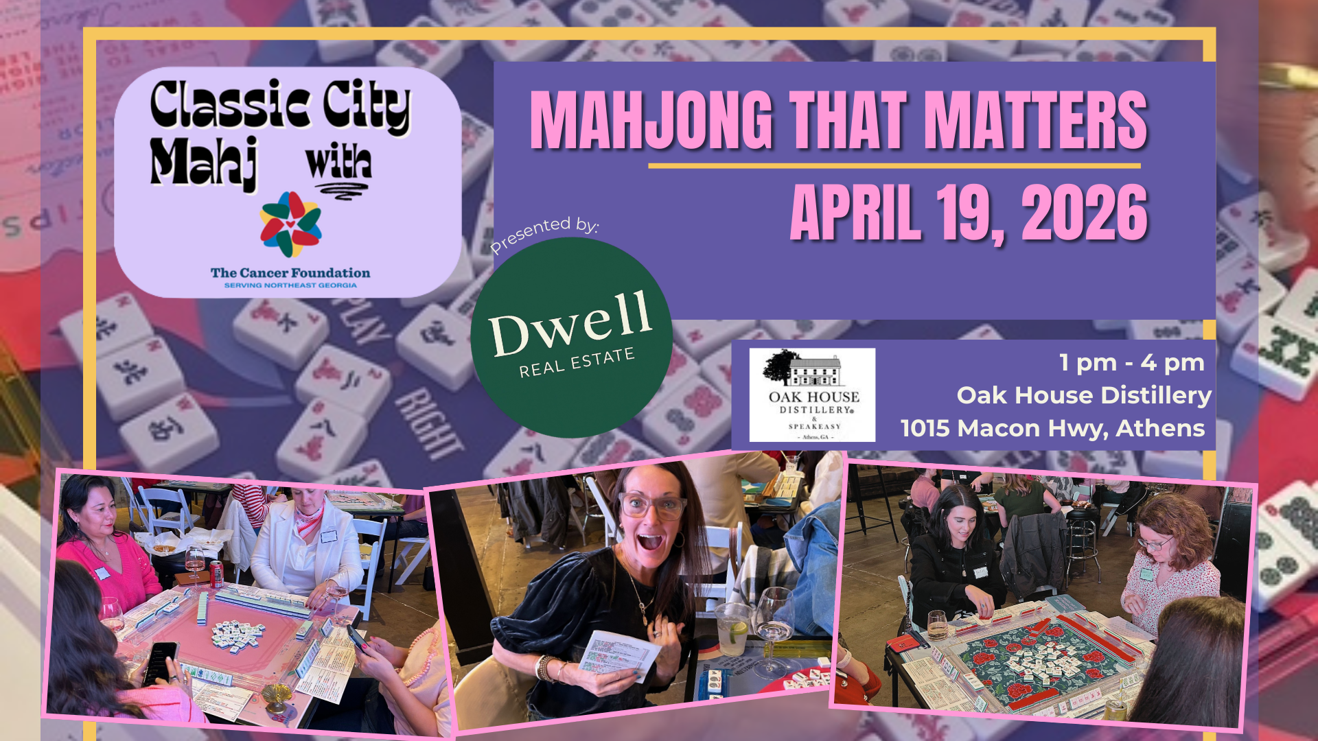 Spend an afternoon playing mahjong for a meaningful cause at Mahjong That Matters, a special fundraising event benefiting The Cancer Foundation. Presented by Dwell Real Estate and hosted in partnership with Classic City Mahj and Oak House Distillery, this event brings together mahjong enthusiasts and community members for an afternoon of friendly competition, lite bites, and fun all while helping support local cancer patients and their families. Whether you're a seasoned player or simply love the game, this event offers a wonderful opportunity to gather, play, and make a difference.